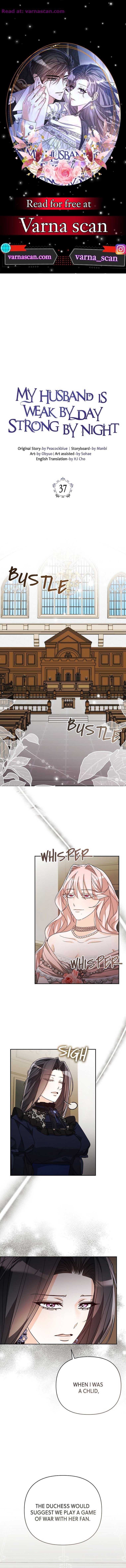 Read the latest manga My Husband is Weak by Day, Strong by Night Chapter 37 at Mangagojo.com . Manga My Husband is Weak by Day Strong by Night is always updated at Mangagojo.com . Dont forget to read the other manga updates. A list of manga collections Mangagojo.com is in the Manga List menu.